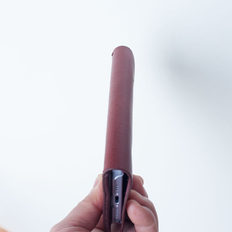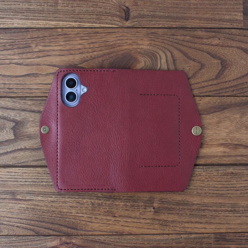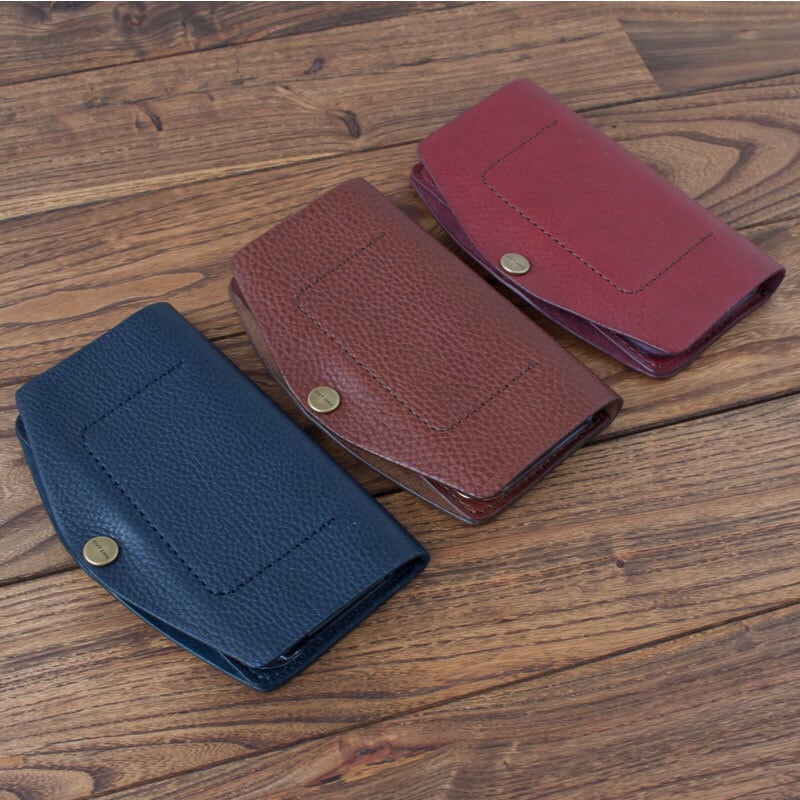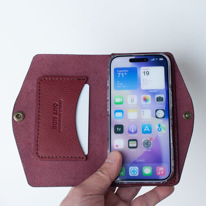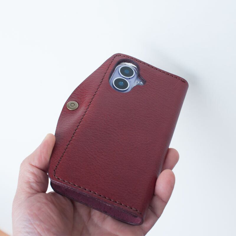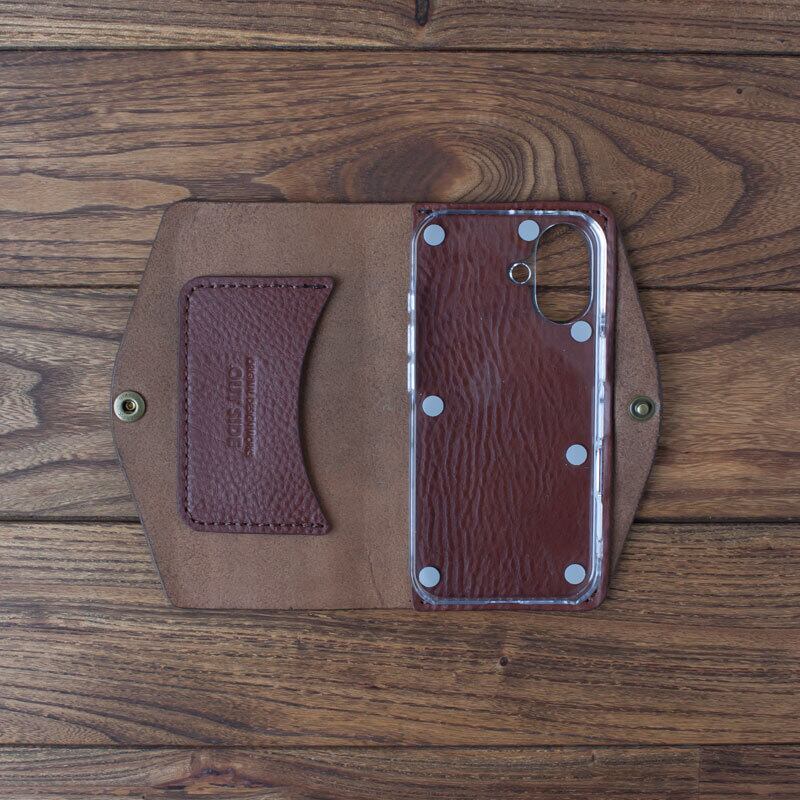 イタリア製のタンニンなめし革に市販のポリカーボネート製のクリアケースを取り付け、手縫いで作ったシンプルなケースです。
