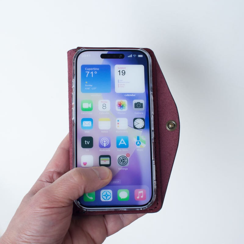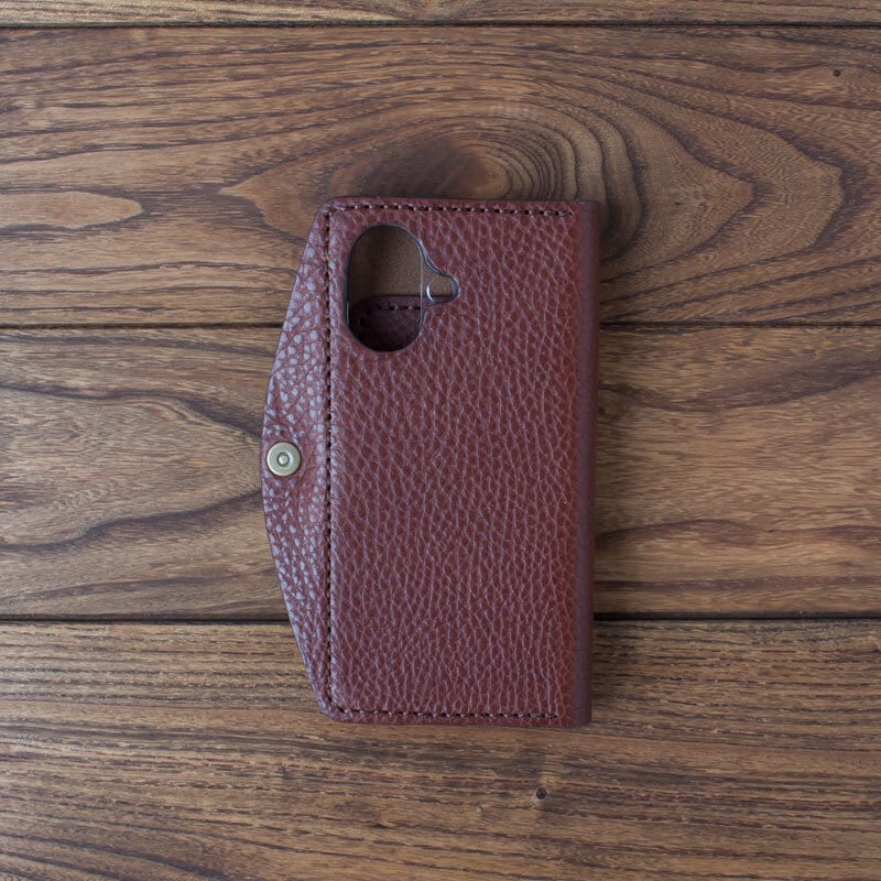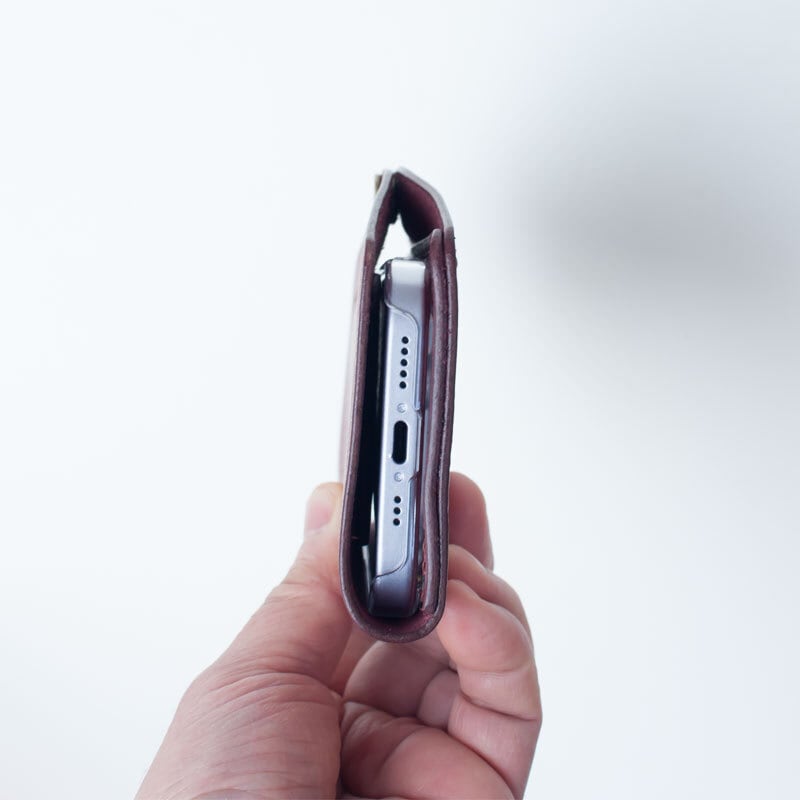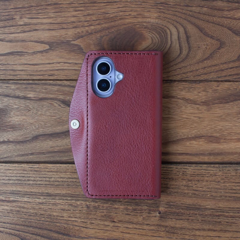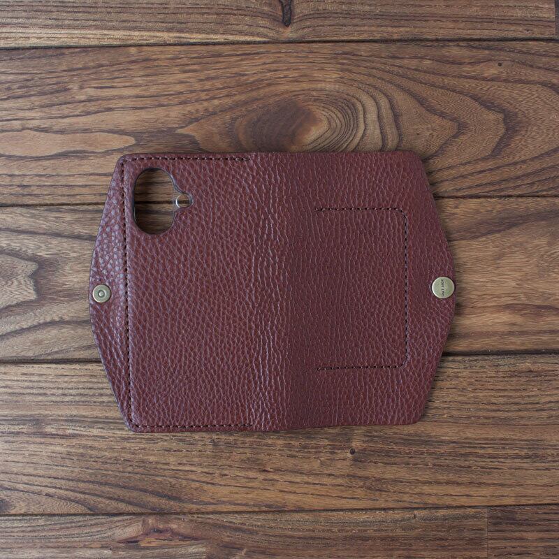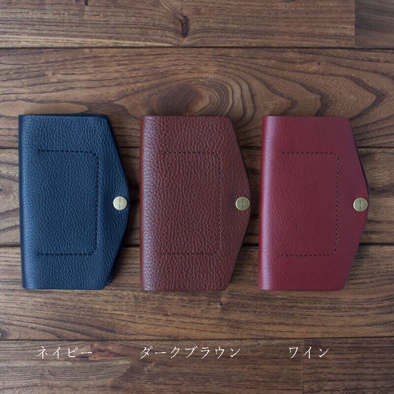 イタリア製のタンニンなめし革に市販のポリカーボネート製のクリアケースを取り付け、手縫いで作ったシンプルなケースです。